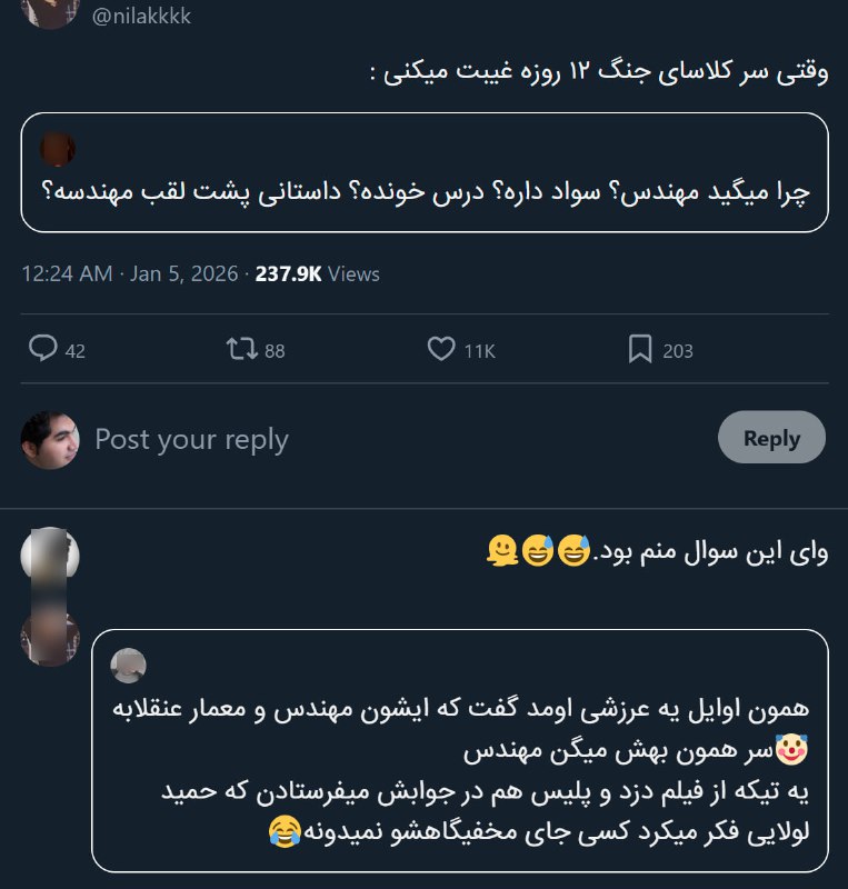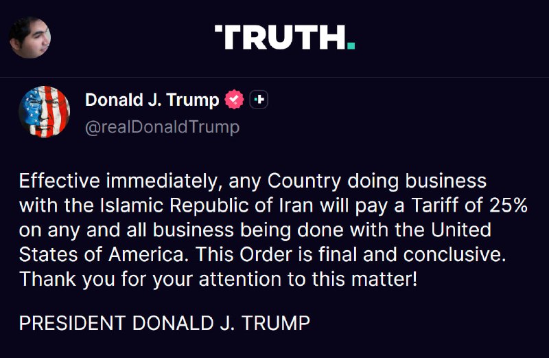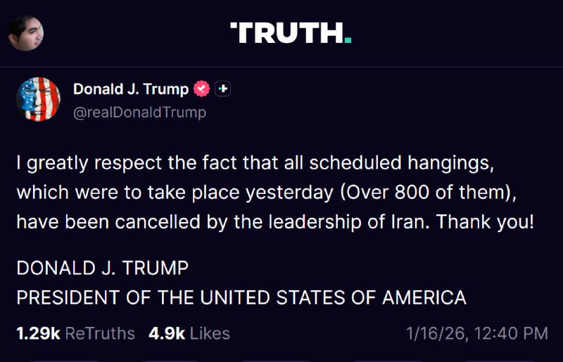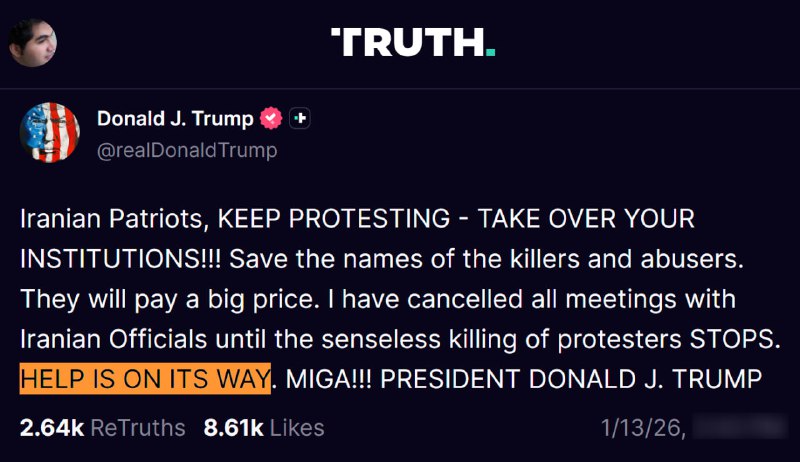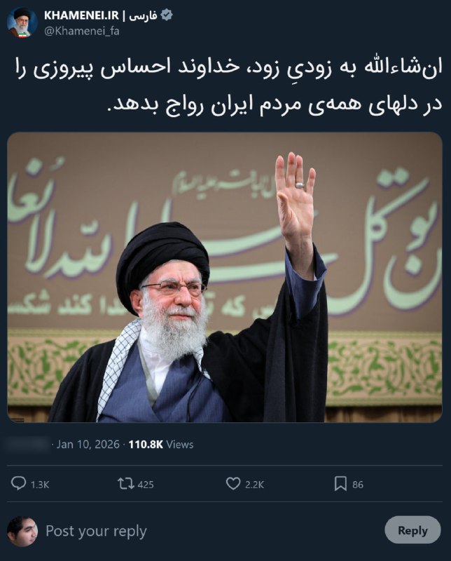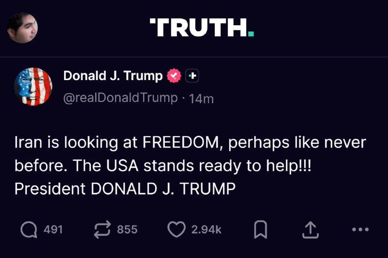 🔸Prince Reza Pahlavi issued a message describing the "magnificent return" of people to the streets on Friday evening, January 19th, as a "crushing response to the threats of the traitorous and criminal leader of the Islamic Republic." He declared: "I am also preparing to return to the homeland to stand alongside you, the great nation of Iran, at the moment of victory for our national revolution."